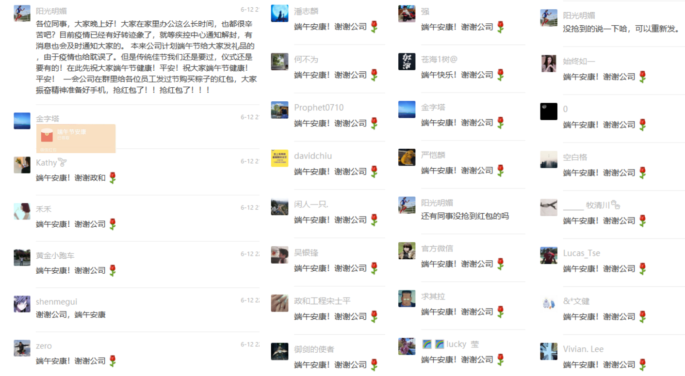 此次疫情防控期間,全體員工在疫情防控期間表現非常配合,雖然居家辦公條件不好,但是都積極創造條件努力工作,生產進度及客戶交流均以網絡、視頻等方式開展,如此艱苦條件下我們看到主管商務的宋總仍在持續保持與新老客戶的溝通并在第一時間報名到臨時辦公點值班;分公司管理部王主管積極跟值班人員溝通分公司的相關事項,保障了分公司項目的正常運作;辦公室梁主管冒著風險出外刻章并每天送章到值班地點;主管生產的曾總仍在群里不斷督促各個項目進度、參與各個項目的方案討論和進度安排;各個項目負責人仍正常與客戶密切交流視頻會議,項目群依舊熱火朝天地談論項目相關工作;建筑專業的鄧工更是在疫情最為嚴峻的那些日子不被疫情所嚇倒,保持著樂觀積極的態度,晚上9點鐘依舊在與客戶視頻會議溝通建筑設計方案等,這樣的員工事例還有很多很多…可以看出他們對公司在此期間的一系列舉措也表示感謝,能感受到政和大家庭的人性關懷和溫情,深知唯有努力工作盡力把公司損失降到最低。他們愿意與公司同心同行,一道堅守自己的職責,有序工作,穩定生產,確保平安。